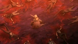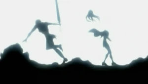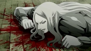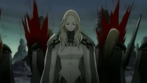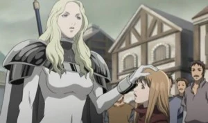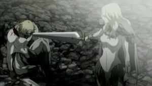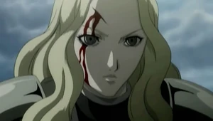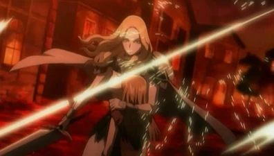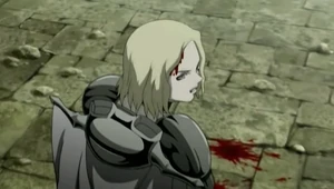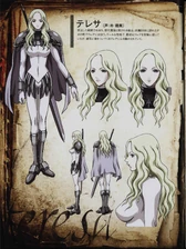 From that point onwards, Teresa began openly displaying her affection for Clare without holding back. However, she decided to leave Clare with foster parents in Rokut, believing a normal life would be best for the young girl. Unfortunately, shortly thereafter, the village was raided by a group of bandits, the same group that was encountered outside of Theo. Teresa rushed back to save Clare and, seeing the latter's bloodied form, flew into a fit of rage.[10] She killed all the bandits, breaking the cardinal rule that a Claymore should never kill humans, no matter what the circumstances.[11]