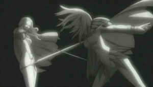 Teresa fends off Priscilla's right arms, slicing them off and going on the offensive. Unhappy with her right leg, Priscilla destroys it to grow a stronger one. With her stronger legs, Priscilla rushes across the battlefield at such speed that she appears invisible. Miria exclaims disbelief in the fact that Priscilla now surpasses even Hysteria's in her Awakened form. Unperturbed, Teresa raises her sword and accurately impales Priscilla through the chest. Teresa then proceeds to slice off Priscilla's left arm despite Deneve's warning that whenever a part of Priscilla is destroyed, the latter simply forms a stronger appendage. True enough, Priscilla instantly grows a much larger arm and slams down on Teresa, who retaliates by crushing the arm with her foot. As Teresa does this, she comments how Clare must have picked this bad habit up from Rafaela.